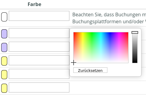 Einstellungen/Buchung Im unteren Bereich, im Abschnitt „Farbschema“, können Sie die Farben der einzelnen Buchungsstatus individuell anpassen. Sie legen die Farbe für den jeweiligen Status fest, indem Sie in der Spalte „Farbe“ auf das entsprechende Feld klicken. Daraufhin öffnet sich eine Farbpalette, aus der Sie die gewünschte Farbe auswählen können. ![]() | |